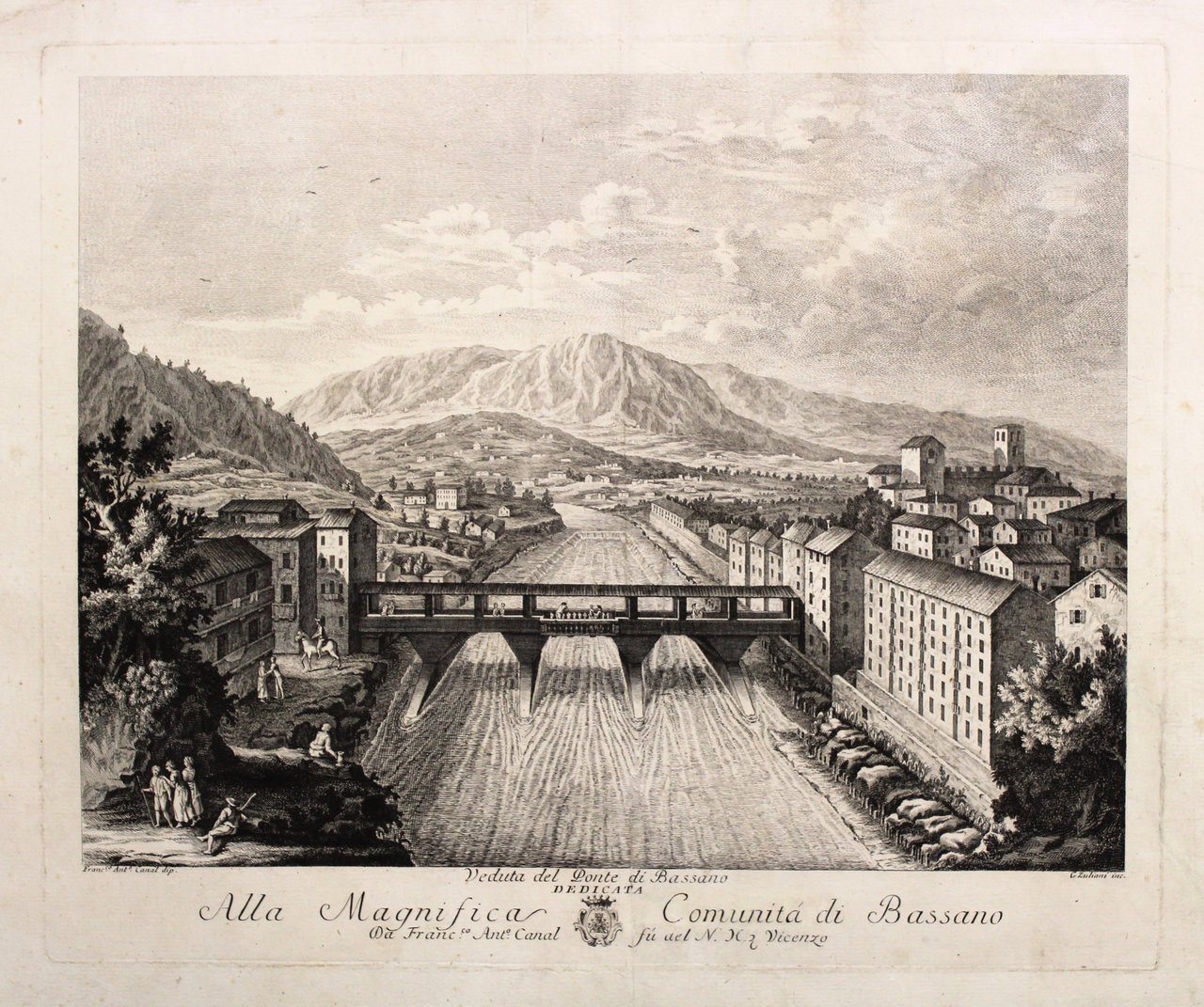 Acquaforte, mm 375x455 (lastra), mm 325x425 (immagine). Firmata in basso in lastra a sin. " Franc.co Ant.o Canal Dip " e " G. Zuliani inc. ". Dedica alla Magnifica Comunità di Bassano al centro. La stampa fa parte della prima rara serie di vedute della città (4): questa bella veduta raffigura il ponte nella ricostruzione del Ferracina con la struttura portante rivestita dalle tavole e il poggiolo nella campata centrale. Bellissimo esemplare con qualche strappo restaurato nella area non incisa. Album Bassanese, stampe e disegni di Bassano e dintorni, 46.