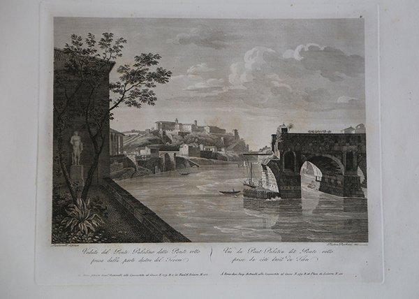 Veduta tratta dall’opera ' Nuova Raccolta delle principali vedute antiche e moderne dell’Alma città di Roma e sue vicinanze, incise a bulino da Pietro ed Achille Parboni e Pietro Ruga l’anno 1830, ' edita da Giacomo Antonelli con imprint ' Roma presso Giacom.o Antonelli in Via del Corso alle Convertite num 179B. Le tavole dell’opera furono incise tra il 1825 e il 1829 da diversi incisori tra i quali i fratelli Parboni e Pietro Ruga. Ciascuna reca il nome dell’incisore, l’indirizzo editoriale e una doppia didascalia in italiano e in francese. Acquaforte, in ottimo stato di conservazione. View taken from the work ' Nuova Raccolta delle principali vedute antiche e moderne dell'Alma città di Roma e sue vicinanze, engraved with engraving by Pietro and Achille Parboni and Pietro Ruga the year 1830, published by Giacomo Antonelli with imprint ' Roma presso Giacom.o Antonelli in Via del Corso alle Convertite num 179B. The plates were engraved between 1825 and 1829 by several engravers including the Parboni brothers and Pietro Ruga. Each bears the engraver's name, editorial address, and a double caption in Italian and French. Etching, in very good condition. Cfr.