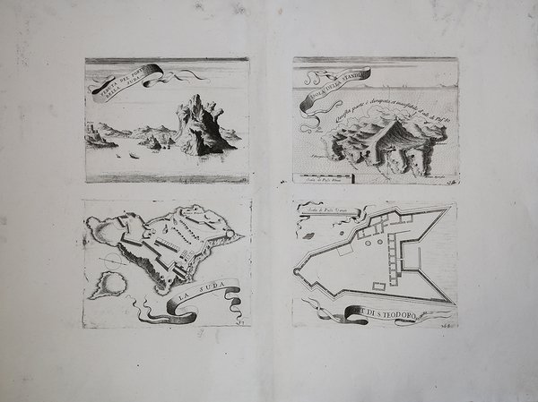 PRIMA EDIZIONE Esemplare tratto dal rarissimo ' Citta, Fortezze e, Isole, e Porti principali dell'Europa in Pianta et in Elevatione, Descritte, e Publicate Ad uso dell'Accademia Cosmografica degli Argonauti dal Padre Maestro Coronelli Lettore, e Cosmografo della Serenissima Republica di Venezia, edito a Venezia da Domenico Padovani nel 1689. Coronelli visse un periodo di straordinaria fecondità editoriale a partire dal 1689, quando ebbe la cattedra di geografia presso l'Università alle Procuratie, con la pubblicazione, nel 1690, del primo volume dell'Atlante Veneto. In effetti sotto il nome di ' Atlante Veneto ' va tutta la raccolta di tredici opere composte nell'arco del decennio successivo, dall'Isolario ' allo ' Specchio del mare. In realtà solo alcune di tali opere possono definirsi atlante, mentre altre, sono opere di compilazione o semplici raccolte di vedute e fortificazioni come questa rara raccolta. Incisione in rame, magnifica prova, con pieni margini, in perfetto stato di conservazione. ' Quattro incisioni da 170x130mm circa. FIRTS ISSUE This example of the map is taken from the very rare Coronelli's ' Citta, Fortezze e, Isole, e Porti principali dell'Europa in Pianta et in Elevatione, Descritte, e Publicate Ad uso dell'Accademia Cosmografica degli Argonauti dal Padre Maestro Coronelli Lettore, e Cosmografo della Serenissima Republica di Venezia, printed in Venice by Domenico Padovani in 1689. Coronelli lived a period of extraordinary editorial fecundity starting from 1689, when he had the chair of geography at the University at the Procuratie, with the publication, in 1690, of the first volume of the ' Atlante Veneto. Under the name of ' Atlante Veneto ' goes the entire collection of thirteen works composed over the next decade, from the ' Isolario ' to the ' Specchio del mare. Copperplate, with full margins, very good condition. Very rare. ' Four engravings of about 170x130mm. Cfr.
