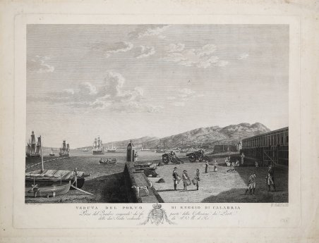 Acquaforte, ultima decade del XVIII secolo, firmata da Giovanni de Grado e Georg Abraham Hackert che traduce a stampa e pubblica il celebre dipinto del fratello Jakob Philipp Hackert appartenente alla serie Vedute dei Porti del Regno conservati nella Reggia di Caserta. Influenzato dai paesaggi di Claude Lorrain e dagli artisti olandesi del XVII secolo, il tedesco Jakob Philipp Hackert (1737-1807) fu uno dei più grandi artisti di paesaggio con sede a Roma fine XVIII secolo. I suoi precisi rendering di siti belli e storici hanno attirato una clientela internazionale durante il Grand tour europeo. Nel 1785 su richiesta del re Ferdinando IV di Borbone si stabilì a Napoli, dopo aver raggiunto il successo grazie a un incarico ricevuto dalla zarina Caterina II di Russia (1782). Presso la corte borbonica, dove lavorò insieme al fratello incisore George Abraham (1755-1805), fu nominato Primo Pittore di Corte con l'incarico di dipingere le vedute più care al re, di consigliarlo sull'acquisto di opere d'arte e di occuparsi dell'educazione artistica dei principi. Inoltre, Hackert curò per il re il trasporto della Collezione Farnese da Roma a Napoli, il restauro dei dipinti della Pinacoteca Reale e la decorazione dei nuovi siti reali di San Leucio e Carditello. Il pittore non aveva ancora portato a compimento la serie dei primi dei dipinti richiestigli quando il Re, nel 1788, gli ordinò di recarsi in Puglia per effettuare un rilevamento topografico complessivo della costa adriatica, con le sue baie ed i suoi porti. Tra il 1789 e il 1792 Hackert ne trasse almeno nove vedute, principiando dal golfo di Manfredonia, scendendo fino al tacco dello stivale, per poi risalire sullo Jonio verso Taranto. Un corpus di studi preparatori alle tele di grande formato della suite dei porti del regno, oggi conservato al Kupferstichkabinett di Berlino, testimonia il lavoro scrupoloso e capillare che sottende la realizzazione delle vedute e dà conto delle numerose prove grafiche che precedevano la stesura dei dipinti. La Reggia di Caserta conserva nelle proprie Collezioni numerose sue opere, comprese le Vedute dei Porti del Regno, commissionate per la Villa Favorita di Resina e divenute modello per un'intera scuola napoletana di pittori per il paesaggio dal vero. La veduta viene stampata a Napoli da Georg Abraham Hackert che dirige e incarica dell’incisione il suo allievo Giovanni de Grado. Bellissima prova, impressa su carta vergata coeva, in ottimo stato di conservazione. Bibliografia Il paesaggio secondo natura, Jacob Philipp Hackert e la sua cerchia, A cura di: Paolo Chiarini; A. Grimaldi, Le Vedute dei Porti del Regno: Jacob Philipp Hackert, Il vedutista al servizio del Re, pp- 313-335; T. Weidner, Jakob Philipp Hackert, Berlino 1998. ' Etching, last decade of the 18th century, signed by Giovanni de Grado and Georg Abraham Hackert, who translated into print and published the famous painting by his brother Jakob Philipp Hackert belonging to the series Views of the Ports of the Kingdom preserved in the Royal Palace of Caserta. Influenced by the landscapes of Claude Lorrain and 17th-century Dutch artists, German Jakob Philipp Hackert (1737-1807) was one of the greatest landscape artists based in Rome late 18th century. His precise renderings of beautiful and historic sites attracted an international clientele during the European Grand Tour. In 1785 at the request of King Ferdinand IV of Borbone he settled in Naples, having achieved success through a commission he received from Tsarina Catherine II of Russia (1782). At the Bourbon court, where he worked together with his engraver brother George Abraham (1755-1805), he was appointed First Court Painter with the task of painting the views dearest to the king, advising him on the purchase of works of art, and dealing with the artistic education of the princes. In addition, Hackert oversaw for the king the transport of the Farnese Collection from Rome to Naples, the restoration of paintings in the Royal Picture Gallery, and the decoration of the new royal sites of San Leucio and Carditello. The painter had not yet completed the series of the first of the paintings requested of him when the king, in 1788, ordered him to travel to Apulia to make an overall topographical survey of the Adriatic coast, with its bays and ports. Between 1789 and 1792 Hackert drew at least nine views from it, starting from the Gulf of Manfredonia, going down to the heel of the boot, and then up the Ionian Sea toward Taranto. A corpus of preparatory studies for the large-format canvases of the suite of ports of the kingdom, now preserved at the Kupferstichkabinett in Berlin, testifies to the painstaking and thorough work underlying the creation of the views and gives an account of the numerous graphic proofs that preceded the drafting of the paintings. The Royal Palace of Caserta holds many of his works in its Collections, including the Views of the Ports of the Kingdom, commissioned for the Villa Favorita in Resina and which became the model for an entire Neapolitan school of painters for landscapes from life. The views were printed in Naples by Georg Abraham Hackert, who directed and commissioned his pupil Giovanni de Grado to do the engraving. Beautiful proof, printed on contemporary laid paper, with margins, very good condition. Bibliografia Il paesaggio secondo natura, Jacob Philipp Hackert e la sua cerchia, A cura di: Paolo Chiarini; A. Grimaldi, Le Vedute dei Porti del Regno: Jacob Philipp Hackert, Il vedutista al servizio del Re, pp- 313-335; T. Weidner, Jakob Philipp Hackert, Berlino 1998. Cfr.