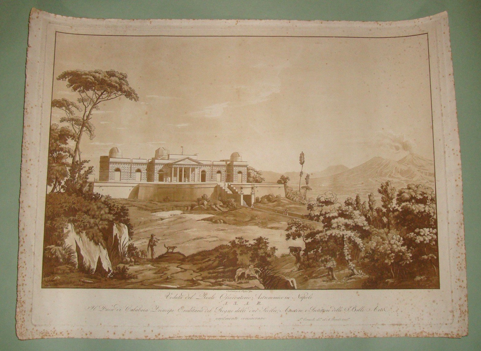 Incisione all'acquatinta edita nel 1825 circa. Architettura di Stefano Gass. L. Cerasoli disegnatore ed A. Pizzala incisore. Cm. 45x65 oltre margini con titolo. Assai rara e pregevole veduta della specola napoletana, famosa in Europa per l'accuratezza delle ricerche. Di assoluto valore artistico la fedele raffigurazione della campagna circostante ricca di alberi e sottobosco. Il Vesuvio fumante sullo sfondo. Suggestiva la tonalità di seppia che impreziosisce vieppiù questa sconosciuta immagine.
