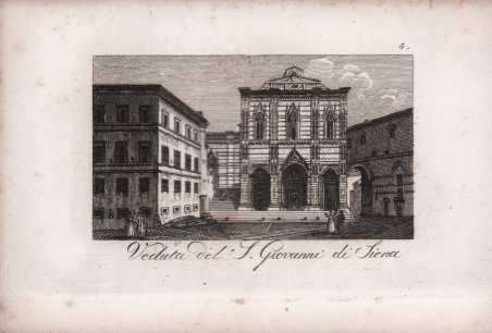 Veduta tratta dal celebre "Il viaggio pittorico della Toscana", stampato a Firenze, per Giovanni Marenigh, 1817.Celebre opera che costituisce uno straordinario affresco iconografico dell'intera Toscana.L'abate Francesco Fontani (Firenze, 1748-1818), dotto erudito, dopo gli studi compiuti nel seminario del Collegio Eugeniano si trasferì a Roma ove insegnò eloquenza nel Collegio Bandinelli. Si dedicò agli studi artistici e archeologici e, rientrato a Firenze, divenne Bibliotecario alla Riccardiana, occupandosi anche della Accademia della Crusca. Fu parroco nella chiesa di Santa Lucia dei Magnoli."Il viaggio pittorico della Toscana" costuisce la sua opera più rinomata.Riproducendo fedelmente le tavole incise dai fratelli Terreni durante il loro viaggio del 1801,fu pubblicata la prima volta tra il 1801 e il 1803 per i tipi del Tofani a Firenze e in seguito, in questa versione ridotta nel formato, da Giovanni Marenigh nel 1817-1818 e nel 1822. View from the famous "Il viaggio pittorico della Toscana", printed in Florence, for Giovanni Marenigh, 1817. The work is considered one of the most important and suggestive pictorial books on Tuscany. Abbot Francesco Fontani (Florence, 1748-1818), after his studies in the seminary of the Collegio Eugeniano ' moved to Rome where he ' taught ' in the Collegio Bandinelli. He accomplished also ' artistic and archaeological studies and, returning to Florence, he became Librarian at the Riccardiana, also taking care of the Accademia della Crusca. He was priest in the church of Santa Lucia dei Magnoli. "Il viaggio pittorico della Toscana" is his most famous work. Perfectly reproducing the plates engraved by the Terreni brothers during their 1801 voyage, it was first published between 1801 and 1803 for the types of Tofani in Florence and later, in this reduced format version, by Giovanni Marenigh in 1817-1818 and in 1822. Cfr. Fossati Bellani, II, 3377; Lozzi, 5462, Bigazzi, 1341 e 1342, cita le edizioni 1801-1803 e 1817.