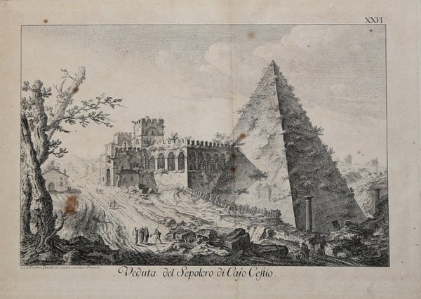 Veduta tratta dal “Briefe über Rom" di Christian Traugott Weinlig, edito tra il 1781 ed il 1787, illustrato da lavori di J. Friederick ispirati alle vedute di Roma di Piranesi. Le opere sono fedeli riduzione della serie "Vedute di Roma" come lo stesso autori dichiara, firmandosi "J.C. J. Friederick F. secundum Piranesi".Acquaforte, in ottimo stato di conservazione. Non comune. View taken from the "Briefe über Rom" by Christian Traugott Weinlig, published between 1781 and 1787, illustrated by J. Friederickn and inspired by Piranesi's views of Rome.Etching, in excellent condition. Cfr.