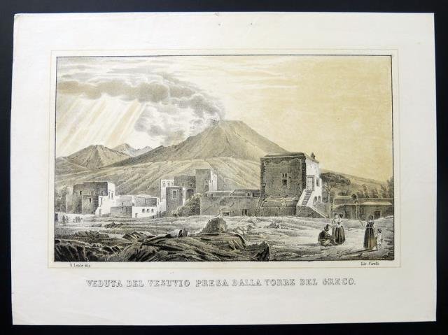 Litografia Cirelli, Napoli, 1850 circa. Tonolitografia, cm 23 x 31 circa (il foglio), disegno di S. Leale. Veduta del Vesuvio presa dalla Torre del Greco, presso Napoli. Buono stato.