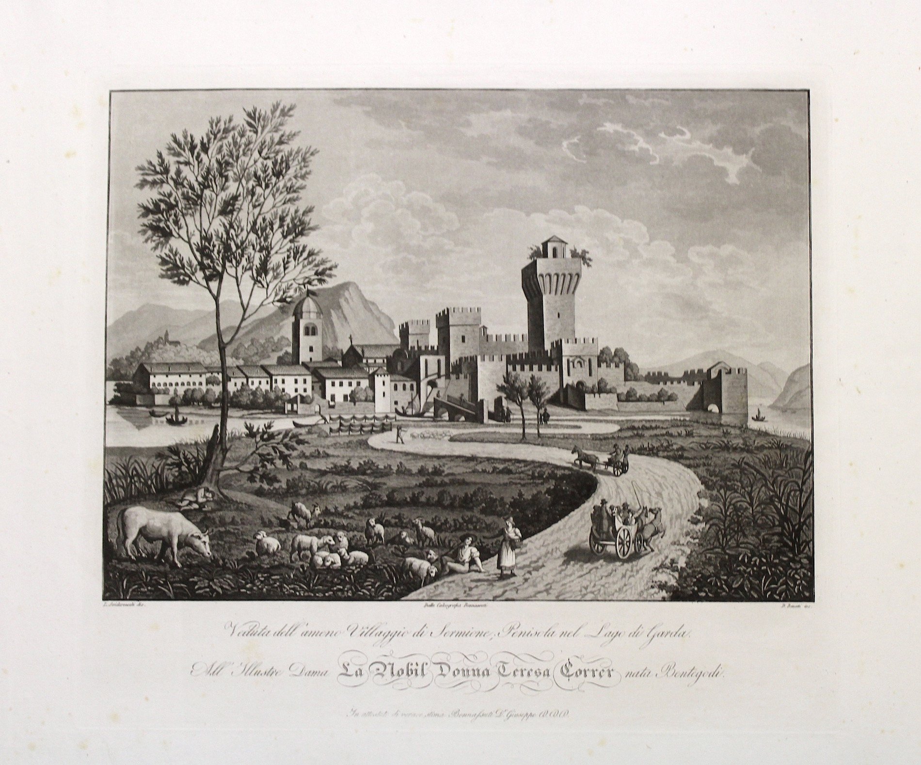 Incisione all'acquatinta dedicata alla nobildonna Teresa Correr, eseguita da D. Bonatti su disegno di C. Bissol, mm 260x355 (misura della battuta del rame). Piacevole veduta del paese benacense, con scena bucolica in primo piano e paese fortificato sullo sfondo. La stampa fa parte di una fra le più ampie ed importanti serie di vedute su Verona e località della provincia pubblicate nel XIX secolo. Ben conservata, con alcune fioriture, e strappetti restaurati.<BR>