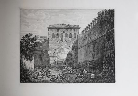 La serie delle vedute de Le Porte Antiche e Moderne del Recinto di Roma con le Mura Prospetti e Piante Geometriche, composta di 35 tavole, edita nel 1829. ' Incisione in rame, ampli margini, in ottimo stato di conservazione. The series of views Le Porte Antiche e Moderne del Recinto di Roma con le Mura Prospetti e Piante Geometriche, 35 plates, published in 1829. ' Copperplate, with wide margins, in very good conditions. Cfr.