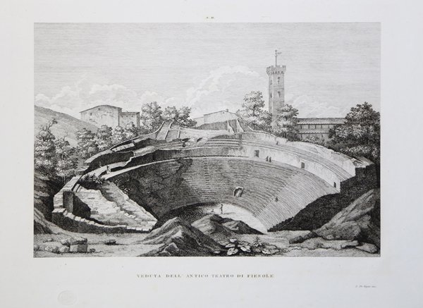 Veduta pubblicata nel noto Atlante illustrativo, ossia Raccolta dei principali monumenti italiani antichi, del Medio evo e moderni, e di alcune vedute pittoriche… di Attilio Zuccagni-Orlandini, edito in 3 tomi nel 1845 a Firenze, per servire di corredo alla Corografia fisica, storica e statistica dell'Italia…, opera in 12 volumi, pubblicati dal 1837 al 1845, corredata - oltre che dall'Atlante illustrativo sopra descritto - anche da un Atlante geografico degli Stati italiani, in due tomi. Attilio Zuccagni Orlandini (1784-1872) nacque a Fiesole con il nome di Giuseppe Orlandini. In seguito all’adozione da parte del facoltoso zio materno Attilio Zuccagni (1754-1807), botanico e georgofilo, assunse il nome di Attilio Zuccagni Orlandini. La sua più importante opera è la relazione geografico-cartografica di tutti gli Stati preunitari italiani, la grandiosa Corografia fisica, storica e statistica dell’Italia e delle sue Isole (Firenze 1835-1845), in dodici volumi per diciannove tomi, con un volume introduttivo sull’intera penisola italiana. L’opera costituì la summa delle centinaia di opere geografiche generali, regionali e locali allora disponibili e presentava, per ogni Stato preunitario, la trattazione fisica, storica, topografica e un inquadramento statistico. Nel 1844-45, la Corografia fu arricchita con cinque volumi di cartografie, vedute e altre illustrazioni di luoghi e monumenti: Atlante geografico degli Stati italiani delineato sopra le migliori e più moderne mappe (due volumi con 144 tavole inclusa la grande carta della penisola in 15 fogli) e Atlante illustrativo ossia raccolta dei principali monumenti italiani antichi, del medio evo e moderni e di alcune vedute pittoriche (tre volumi con 413 illustrazioni, stampate su 269 fogli). Le tavole furono incise, sempre a Firenze, in due apposite officine, da quattro valenti artisti lombardi (Vittorio Angeli, Giacinto Maina, Pietro Manzoni e Giuseppe Pozzi). Soprattutto il primo dei due atlanti rappresenta, ancora oggi, una pietra miliare nella storia della cartografia e dell’iconografia geografica italiana. Fu veramente ‘un’ardua impresa’, dal momento che spesso mancavano ancora (come, ad esempio, per il Ducato di Lucca e lo Stato Pontificio) prodotti cartografici compiutamente geometrici. I due prodotti furono presentati ai Georgofili nel 1843 e nel 1844, insieme alla mappa della Repubblica di San Marino. L’opera si rivelò oltremodo costosa e non ottenne il successo commerciale sperato, ma servì da base per tante altre iniziative editoriali successive che vi attinsero, talora senza neppure rispettarne i diritti d’autore. ' Incisione su rame all'acquaforte, in ottimo stato di conservazione. ' Bibliografia: Anna Guarducci - Dizionario Biografico degli Italiani - Volume 100 (2020). View published in the famous Atlante illustrativo, ossia Raccolta dei principali monumenti italiani antichi, del Medio evo e moderni, e di alcune vedute pittoriche. di Attilio Zuccagni-Orlandini, published in 3 volumes in Florence, 1845, to accompany the Corografia fisica, storica e statistica dell'Italia., a work in 12 volumes, published from 1837 to 1845, accompanied - in addition to the Atlante illustrativo described above - also by a Atlante geografico degli Stati italiani, in two volumes. Attilio Zuccagni Orlandini (1784-1872) was born in Fiesole under the name of Giuseppe Orlandini. Following adoption by his wealthy maternal uncle Attilio Zuccagni (1754-1807), a botanist and georgofile, he took the name Attilio Zuccagni Orlandini. His most important work is the geographic-cartographic report of all the pre-unification Italian states, the great Corografia fisica, storica e statistica dell'Italia e delle sue Isole (Florence 1835-1845), in twelve volumes for nineteen tomes, with an introductory volume on the entire Italian peninsula. The work constituted the sum of hundreds of general, regional and local geographic works then available and presented, for each pre-unification state, the physical, historical, topographical and statistical framework. In 1844-45, the Corografia was enriched with five volumes of maps, views and other illustrations of places and monuments: Atlante geografico degli Stati italiani delineato sopra le migliori e più moderne mappe (two volumes with 144 plates including the large map of the peninsula in 15 sheets) and Atlante illustrativo ossia raccolta dei principali monumenti italiani antichi, del medio evo e moderni e di alcune vedute pittoriche (three volumes with 413 illustrations, printed on 269 sheets). The plates were engraved, again in Florence, in two special workshops, by four talented Lombard artists (Vittorio Angeli, Giacinto Maina, Pietro Manzoni and Giuseppe Pozzi). Especially the first of the two atlases represents, even today, a milestone in the history of cartography and Italian geographic iconography. It was truly 'an arduous undertaking', since cartographic products were often still lacking (as, for example, for the Duchy of Lucca and the Papal States) fully geometric. The two products were presented to the Georgofili in 1843 and 1844, along with the map of the Republic of San Marino. The work proved to be very expensive and did not achieve the commercial success hoped for, but served as a basis for many other subsequent publishing initiatives that drew on it, sometimes without even respecting the copyright. ' Etching, in excellent condition. ' Literature: Anna Guarducci - Dizionario Biografico degli Italiani - Volume 100 (2020). Cfr.