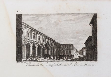Veduta tratta dal celebre "Il viaggio pittorico della Toscana", stampato a Firenze, per Giovanni Marenigh, 1817.Celebre opera che costituisce uno straordinario affresco iconografico dell'intera Toscana. L'abate Francesco Fontani (Firenze, 1748-1818), dotto erudito, dopo gli studi compiuti nel seminario del Collegio Eugeniano si trasferì a Roma ove insegnò eloquenza nel Collegio Bandinelli. Si dedicò agli studi artistici e archeologici e, rientrato a Firenze, divenne Bibliotecario alla Riccardiana, occupandosi anche della Accademia della Crusca. Fu parroco nella chiesa di Santa Lucia dei Magnoli. "Il viaggio pittorico della Toscana" costuisce la sua opera più rinomata.Riproducendo fedelmente le tavole incise dai fratelli Terreni durante il loro viaggio del 1801,fu pubblicata la prima volta tra il 1801 e il 1803 per i tipi del Tofani a Firenze e in seguito, in questa versione ridotta nel formato, da Giovanni Marenigh nel 1817-1818 e nel 1822. Veduta tratta dal celebre "Il viaggio pittorico della Toscana", stampato a Firenze, per Giovanni Marenigh, 1817.Celebre opera che costituisce uno straordinario affresco iconografico dell'intera Toscana. L'abate Francesco Fontani (Firenze, 1748-1818), dotto erudito, dopo gli studi compiuti nel seminario del Collegio Eugeniano si trasferì a Roma ove insegnò eloquenza nel Collegio Bandinelli. Si dedicò agli studi artistici e archeologici e, rientrato a Firenze, divenne Bibliotecario alla Riccardiana, occupandosi anche della Accademia della Crusca. Fu parroco nella chiesa di Santa Lucia dei Magnoli. "Il viaggio pittorico della Toscana" costuisce la sua opera più rinomata.Riproducendo fedelmente le tavole incise dai fratelli Terreni durante il loro viaggio del 1801,fu pubblicata la prima volta tra il 1801 e il 1803 per i tipi del Tofani a Firenze e in seguito, in questa versione ridotta nel formato, da Giovanni Marenigh nel 1817-1818 e nel 1822. Cfr. Fossati Bellani, II, 3377; Lozzi, 5462, Bigazzi, 1341 e 1342, cita le edizioni 1801-1803 e 1817.
