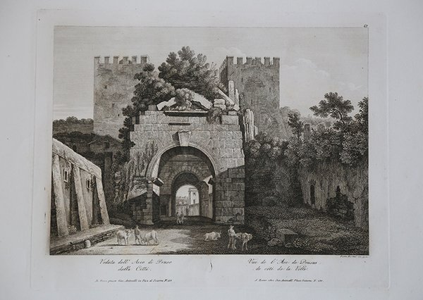 Veduta tratta dall’opera ' Nuova Raccolta delle principali vedute antiche e moderne dell’Alma città di Roma e sue vicinanze, incise a bulino da Pietro ed Achille Parboni e Pietro Ruga l’anno 1830, ' edita da Giacomo Antonelli con imprint ' Roma presso Giacom.o Antonelli in Via del Corso alle Convertite num 179B. Le tavole dell’opera furono incise tra il 1825 e il 1829 da diversi incisori tra i quali i fratelli Parboni e Pietro Ruga. Ciascuna reca il nome dell’incisore, l’indirizzo editoriale e una doppia didascalia in italiano e in francese. Acquaforte, in ottimo stato di conservazione. Veduta tratta dall’opera ' Nuova Raccolta delle principali vedute antiche e moderne dell’Alma città di Roma e sue vicinanze, incise a bulino da Pietro ed Achille Parboni e Pietro Ruga l’anno 1830, ' edita da Giacomo Antonelli con imprint ' Roma presso Giacom.o Antonelli in Via del Corso alle Convertite num 179B. Le tavole dell’opera furono incise tra il 1825 e il 1829 da diversi incisori tra i quali i fratelli Parboni e Pietro Ruga. Ciascuna reca il nome dell’incisore, l’indirizzo editoriale e una doppia didascalia in italiano e in francese. Acquaforte, in ottimo stato di conservazione. Cfr.