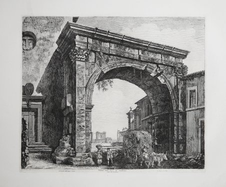 LE ANTICHITA ROMANE Tavola tratta dalla serie delle Antichità Romane, composta di 101 tavole, che viene realizzata con il ricavato della e vendita dei rami della Raccolta di cinquanta principali vedute di antichità tratte da scavi fatti in Roma in questi ultimi tempi divise in 40 vedute, edita nel 1817. Con quest’opera, per il numero delle tavole e per il formato prescelto, di grandi dimensioni, l’incisore vuole affermarsi come figura di primo piano nel mondo artistico romano. In quest’opera Rossini si cimenta in un diretto confronto con il suo predecessore G. B. Piranesi che costituisce un punto di riferimento per un incisore di vedute antiche per quanto riguarda l’originalità e l’ampiezza della riproduzione. Il Rossini, oltre a sottolineare la sua influenza nella scelta del titolo e di alcune didascalie, usa frequentemente le medesime inquadrature e identici punti di vista del maestro veneziano. Altro elemento riconducibile a Piranesi è l’uso della luce e dei forti contrasti chiaroscurali. La volontà di voler animare le vedute, restituendo il monumento al suo contesto storico e la propria inadeguatezza nel campo della figura, porta Rossini ad una collaborazione con Bartolomeo Pinelli, incisore romano, interprete e illustratore del costume e della vita popolare; a cui si devono le figure e i gruppi caratteristici che corredano le vedute. Pinelli, in alcuni casi, riprende i motivi tratti dalle sue precedenti raccolte di Costumi pittoreschi romani. ' Acquaforte, impressa su carta coeva, in ottimo stato di conservazione. ROMAN ANTIQUITIES A nice view taken from the Antichità Romane, set of 101 plates, realized with the proceeds of the sale of the plates used for Raccolta di cinquanta principali vedute di antichità tratte dai scavi fatti in Roma in questi ultimi tempi […], published in 1817. This is the work with which the artist wanted to become one of the most important artists in the Roman cultural life; we can state that if we consider the size of the work and the subject he choose. In this work Rossini tested himself with his predecessor, G. B. Piranesi, who was considered as a point of reference when it came to ancient views and originality. Rossini, was deeply influenced by Piranesi, as it can be seen in the title, the legends, the same points of views and framing. Another important element he took from Piranesi is the use of light and the contrast of chiaroscuro. In these plates Rossini reached the higher mastery of the technique, realizing also extremely particular framings and a new and complex organization of the space. In the plates quite common is the diagonal view of the subject, which gave him the possibility to elaborate more the chiaroscuro. The will to give life to his views, the reinstatement of the monuments to their historic context and the fact that he was not good with figures, brought Rossini to start a partnership with Bartolomeo Pinelli, Roman engraver and costume illustrator of daily life. He was the one who realized the figures of Rossini’s views. Sometimes Pinelli took the subjects from his previous collection Costumi pittoreschi romani. ' Etching, printed on contemporary paper, in very good condition. Cfr. Luigi Rossini incisore. Vedute di roma 1817 - 1850, catalogo della mostra a cura di L. Gavazzi, M. E. Tottoni, Roma Palazzo Braschi, 7 aprile - 15 luglio 1982. Roma
