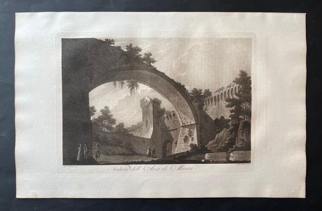 Dal “Viaggio Pittorico della Toscana” di Francesco Fontani, pubblicato per la prima volta a Firenze dall'editore Giuseppe Tofani, tra il 1801 e il 1803. Incisione in rame all'acquatinta disegnata da Antonio Terreni e incisa da Giuseppe Pera, b/n, cm 26 x 36 (alla lastra) più ampi margini. L'opera è considerata uno dei più importanti e suggestivi libri figurati sulla Toscana, sia per la qualità grafica delle incisioni, sia per la grande quantità delle località ritratte. Nei tre volumi in folio che compongono questa ponderosa pubblicazione sono infatti inserite duecentonove tavole, finemente incise all'acquatinta e stampate a inchiostro bruno dai fratelli Antonio e Jacopo Terreni (attivi a Livorno e Firenze tra la fine del diciottesimo e l'inizio del diciannovesimo secolo), da Giovanni Pera e da altri. Nove di queste tavole sono stampate a doppia pagina, raffigurando la carta della regione, una pianta e la veduta delle città principali: Firenze, Siena, Pisa, Livorno; tutte le altre sono stampate a foglio singolo e raffigurano architetture o paesaggi relativi sia alle principali località che ai centri minori della Toscana. Notevole fu il successo del “Viaggio Pittorico della Toscana”, anche per il seguito di riproduzioni e di rifacimenti cui fu sottoposto il suo corredo grafico, in Italia e all'estero. Moltissimi altri libri furono infatti illustrati in seguito con incisioni derivanti dalla grafica dei fratelli Terreni, mentre una seconda edizione dell'opera venne alla luce, in formato ridotto, tra il 1817 e il 1818. Ottimo esemplare.