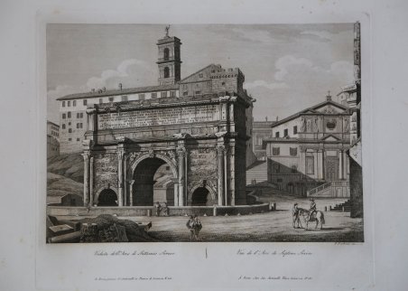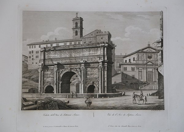 Veduta tratta dall’opera ' Nuova Raccolta delle principali vedute antiche e moderne dell’Alma città di Roma e sue vicinanze, incise a bulino da Pietro ed Achille Parboni e Pietro Ruga l’anno 1830, ' edita da Giacomo Antonelli con imprint ' Roma presso Giacom.o Antonelli in Via del Corso alle Convertite num 179B. Le tavole dell’opera furono incise tra il 1825 e il 1829 da diversi incisori tra i quali i fratelli Parboni e Pietro Ruga. Ciascuna reca il nome dell’incisore, l’indirizzo editoriale e una doppia didascalia in italiano e in francese. Acquaforte, in ottimo stato di conservazione. View taken from the work ' Nuova Raccolta delle principali vedute antiche e moderne dell'Alma città di Roma e sue vicinanze, engraved with engraving by Pietro and Achille Parboni and Pietro Ruga the year 1830, published by Giacomo Antonelli with imprint ' Roma presso Giacom.o Antonelli in Via del Corso alle Convertite num 179B. The plates were engraved between 1825 and 1829 by several engravers including the Parboni brothers and Pietro Ruga. Each bears the engraver's name, editorial address, and a double caption in Italian and French. Etching, in very good condition. Cfr.