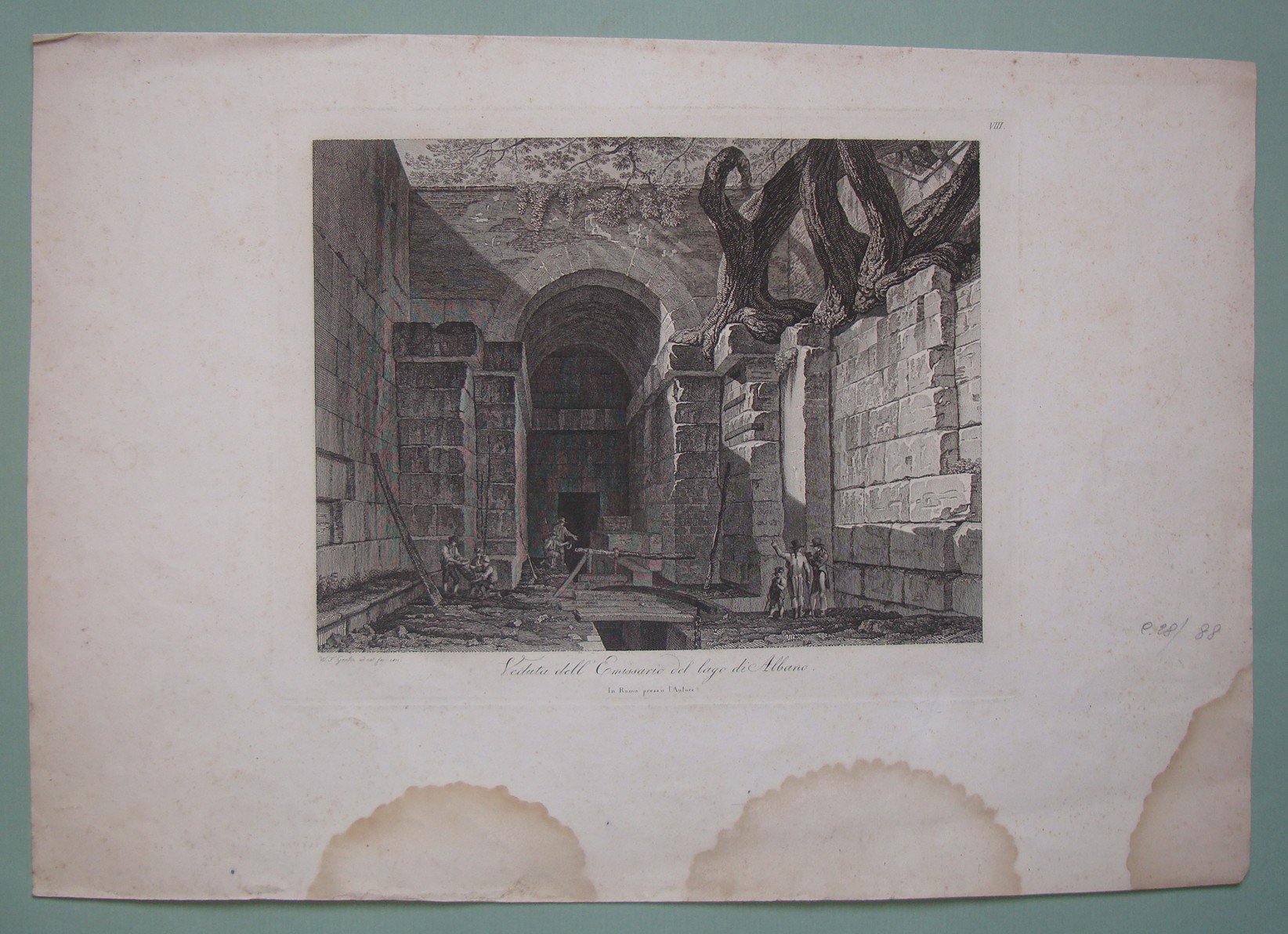 GMELIN W. Veduta dell’emissario del Lago di Albano. 1811. Cm.25x30. Incisione all’acquaforte. Tracce d’umido sui margini.
