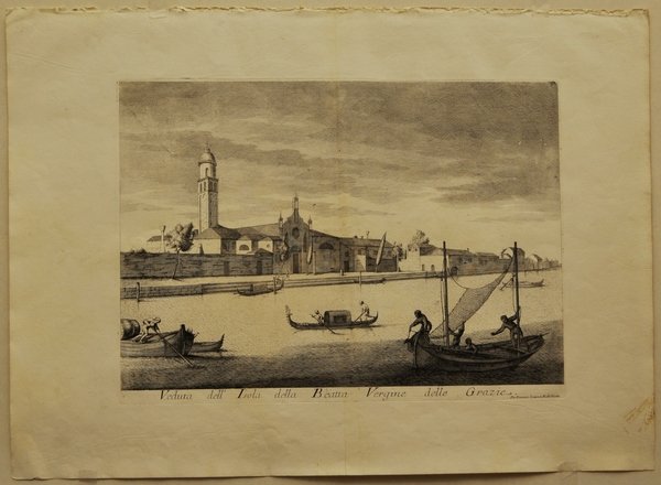 Acquaforte e bulino di mm 467 x 340. Pastosa, spessa, fittamente vergata. Filigrana 2 esse. Stato I/I. Pieni margini . Per il resto foglio senza difetti. "Veduta dell'Isola della Beatta Vergine" al centro in basso, "Per Domenico Lovisa in Rialto Venetia" a destra in basso. Proveniente da: "Il Gran Teatro delle Pitture e Prospettive di Venezia, in due tomi diviso". Il foglio, che rappresenta una delle Isole ancora esistenti, sebbene molto diverse, della Laguna, fa parte della grande opera di Domenico Lovisa, pubblicata a Venezia nel 1720. La suite si componeva di due volumi: il primo, relativo a vedute veneziane e lagunari, venne disegnato da Giuseppe Valeriani, mentre è ignoto chi ne fu l'incisore; il secondo, relativo a pitture di celebri artisti veneziani, venne realizzato da Andrea Zucchi. L'album di vedute, sebbene non eccelso da un punto di vista stilistico, rappresenta la più ampia documentazione sulla vita privata a Venezia nel 1700: la scena è sempre ricolma di azione, spesso anche spiritosa, tutta tesa ad una rappresentazione cronachistica, più che architettonica, di Venezia. Cicogna 4541, Succi 230