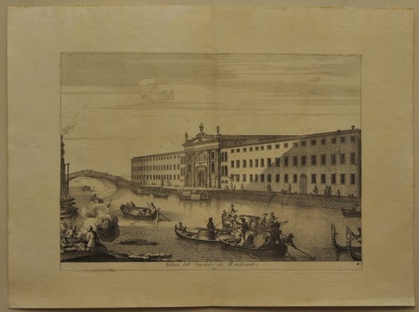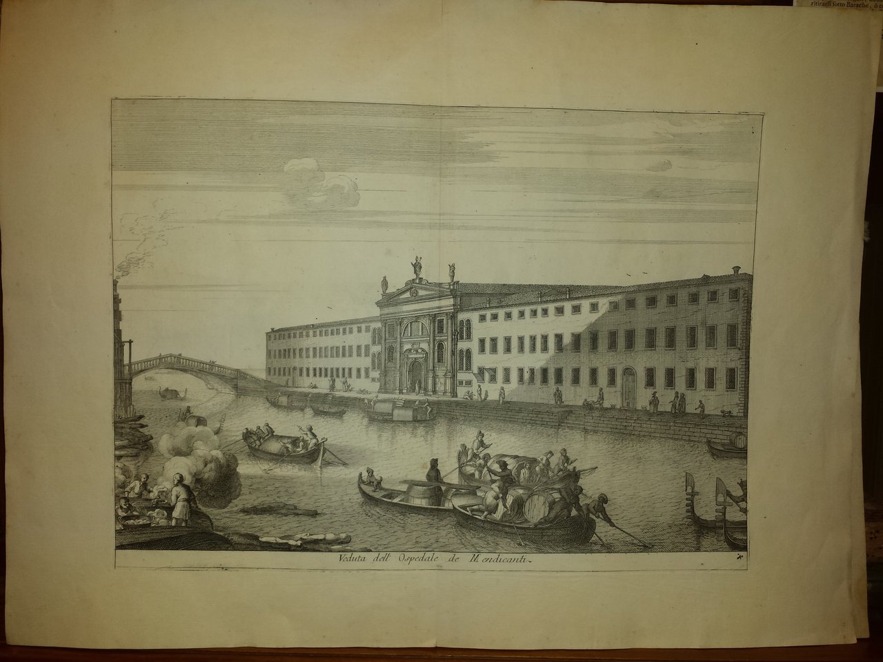 Acquaforte e bulino di mm 467 x 340. In centro in basso "Veduta dell'Ospedale de Mendicanti". Carta pastosa, spessa, fittamente vergata. Stato I/I. Margini pieni. Foglio con piccole imperfezioni ai margini bianchi. Proveniente da: "Il gran teatro di Venezia ovvero raccolta delle principali vedute e pitture che in essa si contengono diviso in due tomi. ". ll foglio fa parte della prima edizione della grande opera di Domenico Lovisa, pubblicata a Venezia intorno al 1717. La Raccolta comprende 122 come risulta dagli indici contenuti nel primo tomo. Quest'ultimo si compone di 57 vedute di Venezia che furono incise da Filippo Vasconi, Giuseppe Valeriani, Carlo e Andrea Zucchi, e da un anonimo intagliatore che siglava le tavole con le iniziali SF. La maggior parte delle vedute però non sono firmate. Cicogna 4541, Succi 230