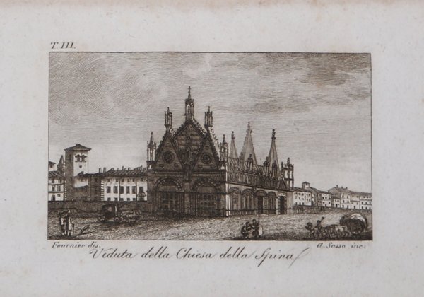 Veduta tratta dal celebre "Il viaggio pittorico della Toscana", stampato a Firenze, per Giovanni Marenigh, 1817.Celebre opera che costituisce uno straordinario affresco iconografico dell'intera Toscana. L'abate Francesco Fontani (Firenze, 1748-1818), dotto erudito, dopo gli studi compiuti nel seminario del Collegio Eugeniano si trasferì a Roma ove insegnò eloquenza nel Collegio Bandinelli. Si dedicò agli studi artistici e archeologici e, rientrato a Firenze, divenne Bibliotecario alla Riccardiana, occupandosi anche della Accademia della Crusca. Fu parroco nella chiesa di Santa Lucia dei Magnoli. "Il viaggio pittorico della Toscana" costuisce la sua opera più rinomata.Riproducendo fedelmente le tavole incise dai fratelli Terreni durante il loro viaggio del 1801,fu pubblicata la prima volta tra il 1801 e il 1803 per i tipi del Tofani a Firenze e in seguito, in questa versione ridotta nel formato, da Giovanni Marenigh nel 1817-1818 e nel 1822. Veduta tratta dal celebre "Il viaggio pittorico della Toscana", stampato a Firenze, per Giovanni Marenigh, 1817.Celebre opera che costituisce uno straordinario affresco iconografico dell'intera Toscana. L'abate Francesco Fontani (Firenze, 1748-1818), dotto erudito, dopo gli studi compiuti nel seminario del Collegio Eugeniano si trasferì a Roma ove insegnò eloquenza nel Collegio Bandinelli. Si dedicò agli studi artistici e archeologici e, rientrato a Firenze, divenne Bibliotecario alla Riccardiana, occupandosi anche della Accademia della Crusca. Fu parroco nella chiesa di Santa Lucia dei Magnoli. "Il viaggio pittorico della Toscana" costuisce la sua opera più rinomata.Riproducendo fedelmente le tavole incise dai fratelli Terreni durante il loro viaggio del 1801,fu pubblicata la prima volta tra il 1801 e il 1803 per i tipi del Tofani a Firenze e in seguito, in questa versione ridotta nel formato, da Giovanni Marenigh nel 1817-1818 e nel 1822. Cfr. Fossati Bellani, II, 3377; Lozzi, 5462, Bigazzi, 1341 e 1342, cita le edizioni 1801-1803 e 1817.