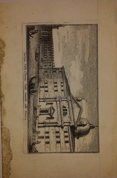 172 x 11 cm, 11,5 x 7,3 cm alla battuta. Acquaforte. Carta vergata forte. Proveniente dalle "Teatro delle fabbriche piu cospicue in prospettiva, della citta di Venezia. Tomo primo (-secondo)".Venezia: nella stamperia di Giambatista Albrizzi q. Gir., (1740). Pallucchini "Incisori Veneti del Settecento" p. 26 :" Fratello di Andrea (Zucchi) , Francesco nacque a Venezia nel1692 e vi morì nel 1764. Discepolo, come incisore, di Andrea, secondo il Moschini - E' copiosissimo il numero degl'intagli, che si ebbero dal suo bulino. Incise illustrazioni di libri, riproduzioni di quadri, vedute di Venezia e di Brescia e qualche ritratto. Fu particolarmente abile nella tecnica dell'acquaforte che trattò con delicatezza e nitidezza. Zucchi Francesco (1692-1764 ; inventore, disegnatore ed incisore).