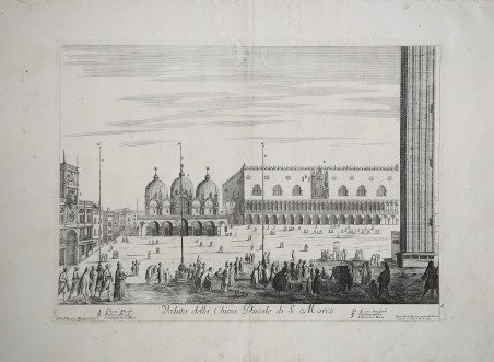 Acquaforte, 1717 circa, firmata in lastra in basso a destra. Veduta di Venezia tratta da ' Il Gran Teatro di Venezia ovvero raccolta delle principali vedute e pitture che in essa si contengono diviso in due tomi ' pubblicato per la prima volta nel 1717 circa da Domenic Lovisa, editore in Venezia nella prima metà del XVIII secolo. Composta di 120 incisioni, l’opera riproduce particolari della città e lavori dei maggiori artisti veneziani. “Domenico Lovisa, che aveva bottega in Rialto. Lovisa pubblicò, nel 1715, un manifesto per divulgare l'iniziativa e trovare gli associati, e si rivolse al doge per chiedere "il benigno privileggio per anni venti acciò non venga coll'inferiori ristampe deturpata". Benché, secondo Gallo (1941), la domanda non fosse stata accolta (le tavole, infatti, sono prive della sigla C. P. E.S., Cum Privilegio Excellentissimi Senatus) l'opera venne pubblicata per la prima volta - senza data - molto probabilmente nel 1717. La prima edizione porta il titolo ' Il Gran Teatro di Venezia ovvero raccolta delle principali vedute e pitture che in essa si contengono diviso in due tomi. La Raccolta comprende 122 tavole, come risulta dagli indici contenuti nel primo tomo. Quest'ultimo si compone di 57 vedute di Venezia che furono incise da Filippo Vasconi, Giuseppe Valeriani, Carlo e Andrea Zucchi e da un anonimo intagliatore che siglava le tavole con le iniziali S. F. Va peraltro precisato che molte vedute non portano alcuna firma. Il secondo tomo, comprendente 65 tavole, contiene una serie di riproduzioni di dipinti, specialmente del Veronese, del Tintoretto e di Palma il Giovane, la cui traduzione incisoria spetta per lo più a Domenico Rossetti e ad Andrea Zucchi su disegni di Silvestro Manaigo e del giovane Giambattista Tiepolo. La seconda edizione apparve nel 1720 con il nuovo titolo ' Il Gran Teatro delle pitture e prospettive di Venezia in due tomi diviso. Segue il Tomo primo. Nel quale si contengono le principale pitture pubbliche di questa città nobilissima disegnate e intagliate da eccellenti professori con l'indice nel principio e con l'esposizione delle medesime cavata dalla miniera della Pittura di Marco Boschini. In Venezia MDCCXX appresso Domenico Lovisa con licenza dei Superiori e privilegio. Indi il ' Tomo secondo nel quale si contengono le prospettive delle fabbriche principali di questa Città nobilissima e dell'isole circonvicine dissegnate e intagliate da eccellenti professori. Le raccolte contengono un numero variabile di tavole. Secondo Calabi la silloge più completa comprenderebbe 57 tavole da dipinti e 66 tavole con vedute prospettiche. Un'ulteriore edizione venne pubblicata dal Viero, il quale aggiunse sulle lastre l'iscrizione ' Appo T. Viero Venezia. Scriveva Pignatti (1968); «Pur trattandosi spesso di rielaborazioni del Carlevarijs, le stampe edite dal Lovisa si distinguono per una notevole vivacità realistica, specie negli aggruppamenti di macchiette, che hanno parte notevole nell'insieme. e per una piacevole luminosità. Il punto di vista uniforme. centrale e rialzato, tradisce l'uso sistematico della camera ottica: l'elaborazione formale varia nelle mani dci diversi disegnatori e incisori [.]»” (cfr. D. Succi, ' Da Carlevarijs a Tiepolo: incisori veneti e friulani del '700, p. 230). Magnifica prova, impressa su carta vergata coeva, priva di filigrana, con ampi margini, tracce di piega centrale verticale, leggere bruniture nei margini, nel complesso in ottimo stato di conservazione. Bibliografia D. Succi, ' Da Carlevarijs a Tiepolo: incisori veneti e friulani del '700, pp. 230-234. Etching, ca. 1717, signed in plate at lower right. View of Venice taken from ' Il Gran Teatro di Venezia ovvero raccolta delle principali vedute e pitture che si contengono in essa, first published about 1717 by Domenico Lovisa, publisher in Venice in the first half of the 18th century. Consisting of 122 engravings, the work reproduces details of the city and works by major Venetian artists. “Domenico Lovisa, who had a workshop in Rialto. Lovisa published, in 1715, a manifesto to publicize the initiative and find associates, and appealed to the doge to ask for "il benigno privileggio per anni venti acciò non venga coll'inferiori ristampe deturpata". Although, according to Gallo (1941), the request was not granted (the plates, in fact, lack the initials ' C. P. E.S., Cum Privilegio Excellentissimi Senatus) the work was first published -undated- most likely in 1717. ' The first edition bears the title ' Il Gran Teatro di Venezia ovvero raccolta delle principali vedute e pitture che si contengono in essa. ' The Collection includes 122 plates, as can be seen from the indexes contained in the first tome. The latter consists of 57 views of Venice that were engraved by Filippo Vasconi, Giuseppe Valeriani, Carlo and Andrea Zucchi and an anonymous engraver who initialed the plates with the initials S. F. It should also be pointed out that many views bear no signature. The second tome, comprising 65 plates, contains a series of reproductions of paintings, especially by Veronese, Tintoretto and Palma il Giovane, the engraving translation of which is mostly the responsibility of Domenico Rossetti and Andrea Zucchi from drawings by Silvestro Manaigo and the young Giambattista Tiepolo. The second edition appeared in 1720 with the new title ' Il Gran Teatro delle pitture e prospettive di Venezia in due tomi diviso. Segue il Tomo primo. Nel quale si contengono le principale pitture pubbliche di questa città nobilissima disegnate e intagliate da eccellenti professori con l'indice nel principio e con l'esposizione delle medesime cavata dalla miniera della Pittura di Marco Boschini. In Venezia MDCCXX appresso Domenico Lovisa con licenza dei Superiori e privilegio. And ' Tomo secondo nel quale si contengono le prospettive delle fabbriche principali di questa Città nobilissima e dell'isole circonvicine dissegnate e intagliate da eccellenti professori. ' The collections 