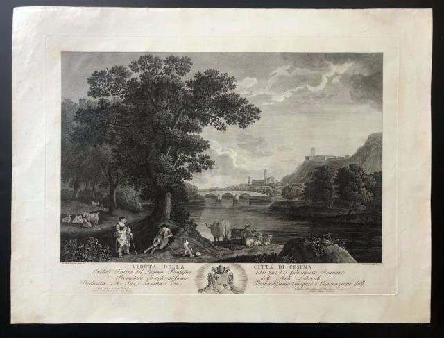 Roma, 1790 circa. Incisione in rame all’acquaforte, b/n, cm 42,2 x 58 (alla lastra), cm 51,5 x 68,5 (il foglio), al centro il titolo e la dedica a Papa Pio Sesto, in bs. a sn. “Ja. Ph. Hackert pinx. Romae 1776”, in bs. a ds. “Isac Lacroix sculp. Romae”. Bella veduta della città di Cesena realizzata come pittoresca scena bucolica animata in primo piano. Philipp Jakob Hackert (Prenzlau, 1737 – Firenze, 1807), di origine tedesca, fu ottimo pittore. Fin da giovane compì numerosi viaggi in Italia e si stabilì definitivamente a Roma verso il 1768. Divenne pittore di corte del re di Napoli e nel 1780 realizzò il famoso ciclo di dipinti “Dieci vedute della Casa di Campagna di Orazio”. Celebri le pitture raffiguranti la Reggia di Caserta. Tranne alcune brevi imperfezioni al margine superiore, ottimo esemplare in bella morsura e ampi margini.
