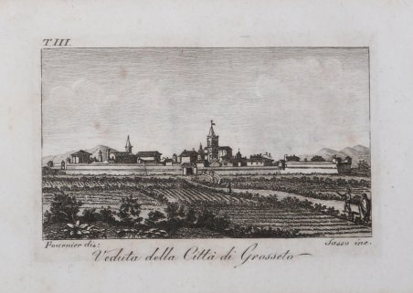Veduta tratta dal celebre "Il viaggio pittorico della Toscana", stampato a Firenze, per Giovanni Marenigh, 1817.Celebre opera che costituisce uno straordinario affresco iconografico dell'intera Toscana. L'abate Francesco Fontani (Firenze, 1748-1818), dotto erudito, dopo gli studi compiuti nel seminario del Collegio Eugeniano si trasferì a Roma ove insegnò eloquenza nel Collegio Bandinelli. Si dedicò agli studi artistici e archeologici e, rientrato a Firenze, divenne Bibliotecario alla Riccardiana, occupandosi anche della Accademia della Crusca. Fu parroco nella chiesa di Santa Lucia dei Magnoli. "Il viaggio pittorico della Toscana" costuisce la sua opera più rinomata.Riproducendo fedelmente le tavole incise dai fratelli Terreni durante il loro viaggio del 1801,fu pubblicata la prima volta tra il 1801 e il 1803 per i tipi del Tofani a Firenze e in seguito, in questa versione ridotta nel formato, da Giovanni Marenigh nel 1817-1818 e nel 1822. Veduta tratta dal celebre "Il viaggio pittorico della Toscana", stampato a Firenze, per Giovanni Marenigh, 1817.Celebre opera che costituisce uno straordinario affresco iconografico dell'intera Toscana. L'abate Francesco Fontani (Firenze, 1748-1818), dotto erudito, dopo gli studi compiuti nel seminario del Collegio Eugeniano si trasferì a Roma ove insegnò eloquenza nel Collegio Bandinelli. Si dedicò agli studi artistici e archeologici e, rientrato a Firenze, divenne Bibliotecario alla Riccardiana, occupandosi anche della Accademia della Crusca. Fu parroco nella chiesa di Santa Lucia dei Magnoli. "Il viaggio pittorico della Toscana" costuisce la sua opera più rinomata.Riproducendo fedelmente le tavole incise dai fratelli Terreni durante il loro viaggio del 1801,fu pubblicata la prima volta tra il 1801 e il 1803 per i tipi del Tofani a Firenze e in seguito, in questa versione ridotta nel formato, da Giovanni Marenigh nel 1817-1818 e nel 1822. Cfr. Fossati Bellani, II, 3377; Lozzi, 5462, Bigazzi, 1341 e 1342, cita le edizioni 1801-1803 e 1817.