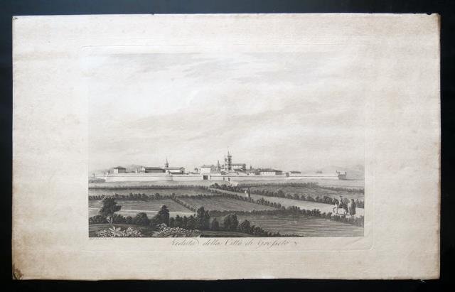 Dal “Viaggio Pittorico della Toscana” di Francesco Fontani, pubblicato per la prima volta a Firenze dall'editore Giuseppe Tofani, tra il 1801 e il 1803. Incisione in rame all'acquatinta disegnata e incisa da Antonio Terreni ("Ant. Terreni dis. e inc." in lastra in basso a sinistra), b/n, cm 26 x 36 (alla lastra) più margini. L'opera è considerata uno dei più importanti e suggestivi libri figurati sulla Toscana, sia per la qualità grafica delle incisioni, sia per la grande quantità delle località ritratte. Nei tre volumi in folio che compongono questa ponderosa pubblicazione sono infatti inserite duecentonove tavole, finemente incise all'acquatinta e stampate a inchiostro bruno dai fratelli Antonio e Jacopo Terreni (attivi a Livorno e Firenze tra la fine del diciottesimo e l'inizio del diciannovesimo secolo), da Giovanni Pera e da altri. Nove di queste tavole sono stampate a doppia pagina, raffigurando la carta della regione, una pianta e la veduta delle città principali: Firenze, Siena, Pisa, Livorno; tutte le altre sono stampate a foglio singolo e raffigurano architetture o paesaggi relativi sia alle principali località che ai centri minori della Toscana. Notevole fu il successo del “Viaggio Pittorico della Toscana”, anche per il seguito di riproduzioni e di rifacimenti cui fu sottoposto il suo corredo grafico, in Italia e all'estero. Moltissimi altri libri furono infatti illustrati in seguito con incisioni derivanti dalla grafica dei fratelli Terreni, mentre una seconda edizione dell'opera venne alla luce, in formato ridotto, tra il 1817 e il 1818. Esemplare fisiologicamente ingiallito dal tempo e con alcune ordinarie imperfezioni della carta ma in buono stato di conservazione. .