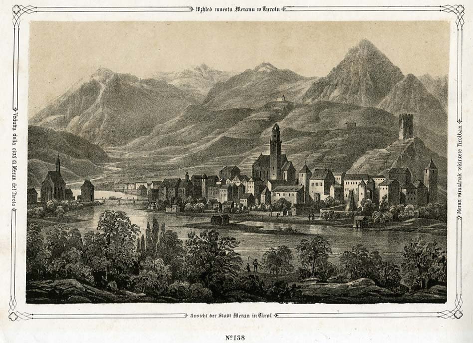Litografia di dimensioni 15x22 cm. Condizioni : USATO - Stato : Buono, ordinari segni d'uso e del tempo. Altre note : Veduta della città di Merano in Tirolo. L'abitato si sviluppa lungo il torrente Passirio, che scorre occupando il primo piano. I monumenti che spiccano tra i tetti delle case sono castel Zeno (Zenoburg) sulla destra e il campanile gotico della parrocchiale dedicata a S. Nicolò in centro. Sullo sfondo si apre la Val Venosta. La stampa si trova entro una semplice cornice, inframmezzata ai quattro lati dal titolo tradotto in quattro lingue diverse.