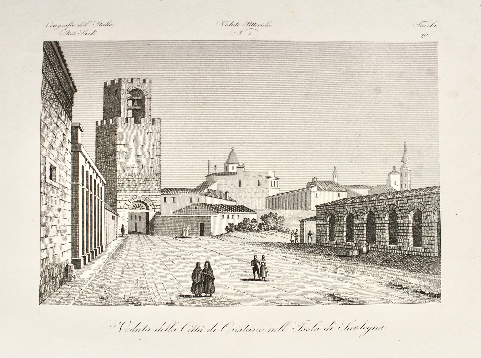 Incisione in rame di mm 295x385. Attilio Zuccagni-Orlandini (1784-1872) fu un cartografo e geografo italiano. La sua opera principale è senza dubbio la Corografia fisica, storica e statistica dell'Italia e delle sue isole, cui l'incisione appartiene. La Corografia si compone di dodici tomi (senza contare i vari supplementi), stampati tra il 1833 e il 1845, ed è corredata da un atlante in due volumi e da numerose mappe geografiche e topografiche, nonché da tavole illustrative. Buon esemplare, rifilato al margine inferiore, con leggero strato di sporco superficiale al margine superiore.