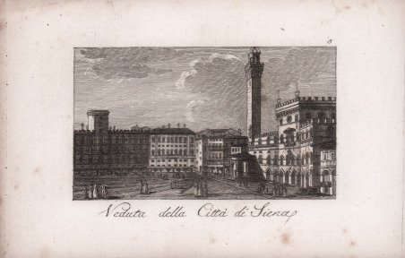Veduta tratta dal celebre "Il viaggio pittorico della Toscana", stampato a Firenze, per Giovanni Marenigh, 1817.Celebre opera che costituisce uno straordinario affresco iconografico dell'intera Toscana.L'abate Francesco Fontani (Firenze, 1748-1818), dotto erudito, dopo gli studi compiuti nel seminario del Collegio Eugeniano si trasferì a Roma ove insegnò eloquenza nel Collegio Bandinelli. Si dedicò agli studi artistici e archeologici e, rientrato a Firenze, divenne Bibliotecario alla Riccardiana, occupandosi anche della Accademia della Crusca. Fu parroco nella chiesa di Santa Lucia dei Magnoli."Il viaggio pittorico della Toscana" costuisce la sua opera più rinomata.Riproducendo fedelmente le tavole incise dai fratelli Terreni durante il loro viaggio del 1801,fu pubblicata la prima volta tra il 1801 e il 1803 per i tipi del Tofani a Firenze e in seguito, in questa versione ridotta nel formato, da Giovanni Marenigh nel 1817-1818 e nel 1822. View from the famous "Il viaggio pittorico della Toscana", printed in Florence, for Giovanni Marenigh, 1817. The work is considered one of the most important and suggestive pictorial books on Tuscany. Abbot Francesco Fontani (Florence, 1748-1818), after his studies in the seminary of the Collegio Eugeniano ' moved to Rome where he ' taught ' in the Collegio Bandinelli. He accomplished also ' artistic and archaeological studies and, returning to Florence, he became Librarian at the Riccardiana, also taking care of the Accademia della Crusca. He was priest in the church of Santa Lucia dei Magnoli. "Il viaggio pittorico della Toscana" is his most famous work. Perfectly reproducing the plates engraved by the Terreni brothers during their 1801 voyage, it was first published between 1801 and 1803 for the types of Tofani in Florence and later, in this reduced format version, by Giovanni Marenigh in 1817-1818 and in 1822. Cfr. Fossati Bellani, II, 3377; Lozzi, 5462, Bigazzi, 1341 e 1342, cita le edizioni 1801-1803 e 1817.