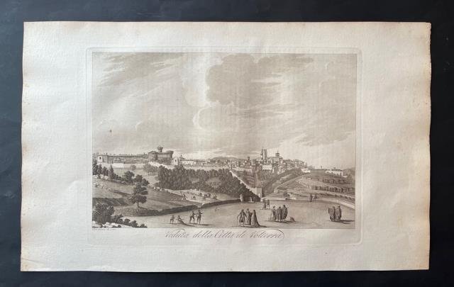 Dal “Viaggio Pittorico della Toscana” di Francesco Fontani, pubblicato per la prima volta a Firenze dall'editore Giuseppe Tofani, tra il 1801 e il 1803. Incisione in rame all'acquatinta disegnata e incisa da Antonio Terreni, b/n, cm 26 x 36 (alla lastra) più ampi margini. L'opera è considerata uno dei più importanti e suggestivi libri figurati sulla Toscana, sia per la qualità grafica delle incisioni, sia per la grande quantità delle località ritratte. Nei tre volumi in folio che compongono questa ponderosa pubblicazione sono infatti inserite duecentonove tavole, finemente incise all'acquatinta e stampate a inchiostro bruno dai fratelli Antonio e Jacopo Terreni (attivi a Livorno e Firenze tra la fine del diciottesimo e l'inizio del diciannovesimo secolo), da Giovanni Pera e da altri. Nove di queste tavole sono stampate a doppia pagina, raffigurando la carta della regione, una pianta e la veduta delle città principali: Firenze, Siena, Pisa, Livorno; tutte le altre sono stampate a foglio singolo e raffigurano architetture o paesaggi relativi sia alle principali località che ai centri minori della Toscana. Notevole fu il successo del “Viaggio Pittorico della Toscana”, anche per il seguito di riproduzioni e di rifacimenti cui fu sottoposto il suo corredo grafico, in Italia e all'estero. Moltissimi altri libri furono infatti illustrati in seguito con incisioni derivanti dalla grafica dei fratelli Terreni, mentre una seconda edizione dell'opera venne alla luce, in formato ridotto, tra il 1817 e il 1818. Ottimo esemplare.
