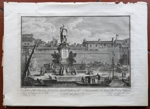 Veduta tratta da “Raccolta delle più belle vedute della città e porto di Livorno”, Giuseppe Maria Terreni, Livorno, 1783. L'opera, edita e stampata da Giuseppe Maria Terreni, si compone di un frontespizio inciso, di una dedica a Pietro Leopoldo, di una pianta della città e di 17 tavole numerate, incise in rame da Berardi, Daniotto, Fambrini, Galli e Nerici. Incisione in rame all'acquaforte, b/n, cm 28 x 38 circa (alla lastra) più margini. In lastra, in basso a destra, n. 8. Esemplare nel primo stato su due, stampato dal Terreni. Le tavole furono successivamente ristampate con imprint “In Livorno Presso Giacomo Aliprandi”. Esemplare stampato su buona carta e in ampi margini, buono lo stato di conservazione.