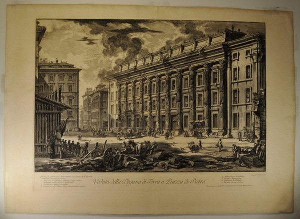 Incisione all'acquaforte di mm 650 x 445 alla battuta, su foglio perfetto, carta forte, pieni margini. Terzo stato su sei. Ottima impressione. Diciture: in basso a sinistra "Questa fu fabbricata sulle rovine del Tempio di M. Aurelio Antonino Pio nel suo Foro. 1 Avanzo di Colonne rimaste, oggi mezzo internate nella nuova Fabbrica 2 Architrave antico ristorato 3 Cornicione, ed Ordine Attico nuovamente rifatto."; al centro "Veduta della Dogana di Terra a Piazza di Pietra"; più a destra "4 Abitazione moderna 5 Collegio Bergamasco 6 Quartiere de' Soldati 7 Strada che va al Corso"; ed in piccolo più sotto "Presso l'Autore a Strada Felice nel Palazzo Tomati vicino alla Trinità de' Monti"; e un po' più in alto "Piranesi Architetto fec.". Proviene dalla raccolta "Vedute di Roma disegnate ed incise da Giambattista Piranesi Architetto Veneziano". Hind 32.