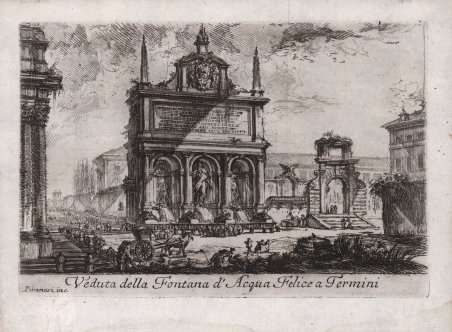 Acquaforte, 1745 circa, firmata in lastra. Magnifica prova, con pieni margini, in perfetto stato di conservazione.Opera tratta dalle “Varie Vedute di Roma Antica, e Moderna. Disegnate e Intagliate da Celebri Autori” stampata in Roma “a spese di Fausto Amidei”, 1748.La raccolta, in 4° oblungo, viene pubblicata da Fausto Amidei in varie edizioni dal 1745 al 1750, e da Giovanni Bouchard nel 1752. Conteneva frontespizio inciso e 93/96 tavole, delle quali 47 firmate Piranesi in lastra ed altre da Giraud, Carloni, Nicole, Mogalli, Bellicard, Le Geay, ed Anesi.Opere giovanili del Piranesi, appena giunto a Roma dove fu allievo della bottega di Giuseppe Vasi. Vasi lavora alle sue vedute, che presentate come raccolta, prenderanno dal 1747 il nome delle 'Magnificenze di Roma'; agli inizi dell’opera Piranesi lo affianca, ma, almeno dal 1744, produce sue proprie vedutine, che nel 1745 formano il nucleo più importante delle 'Varie Vedute di Roma antica e moderna disegnate e intagliate da celebri autori' per il libraio ed editore Amidei. Etching, around 1745, signed in plate. A very good impression with full margins, in perfect condition.Taken from the “Varie Vedute di Roma Antica, e Moderna. Disegnate e Intagliate da Celebri Autori” printe in Rome by Fausto Amidei, 1748.The collection, in 4th oblong, is published by Fausto Amidei in various editions from 1745 to 1750, and by Giovanni Bouchard in 1752. It contained an engraved frontispiece and 93/96 plates, of which 47 signed by Piranesi and others by Giraud, Carloni, Nicole, Mogalli, Bellicard, Le Geay, and Anesi.Early works by Piranesi, who had just arrived in Rome where he was a student of the workshop of Giuseppe Vasi. Vasi’s works will take the name of the 'Magnificenze di Roma'; from 1747; at the beginning of the work Piranesi joined him, but, at least since 1744, he produced his own views, which in 1745 formed the most important nucleus of the 'Varie Vedute di Roma antica e moderna disegnate e intagliate da celebri autori' for the bookseller and editor Amidei. Cfr.