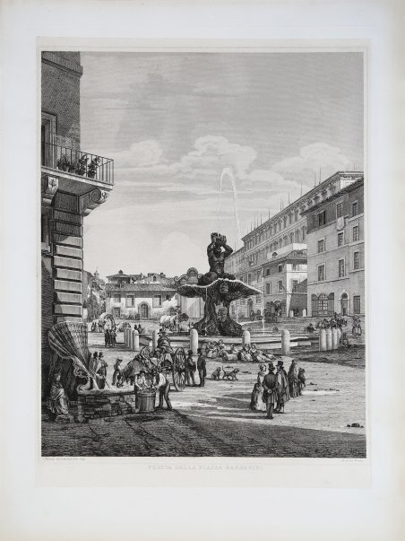 Rara veduta tratta dalla "Scenografia di Roma moderna che comprende le più in belle vedute delle principali piazze, stradee fontane" stampata tra 1848 e il 1850, composta da 20 splendide vedute disegnate e incise da Rossini. Attraverso questa opera l'autore abbandona il consueto soggetto archeologico dedicandosi in maniera significativa agli attori che si muovono all'interno di queste moderne prospettive e che non sono più rappresentati soltanto dalla ingenua schiera di ' popolani di pinelliana memoria, ma anche dall'elegante e composta borghesia romana che attraversa la città, a passeggio o ' in carrozza, già in apparenza dimentica dei moti del 1848 e della breve Seconda Repubblica Romana. Acquaforte, firmata in lastra lungo il margine inferiore "L. Rossini Arch. dis. dal vero 1848" e "ed incise Roma", con margini, in ottimo stato di conservazione. ' Cfr.