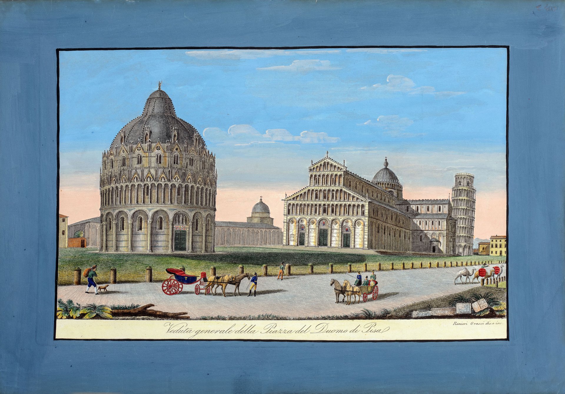 Incisione all'acquaforte, splendida coloritura coeva, mm 215 x 330, tratta dalla raccolta del Ranieri Grassi "Rappresentazione degli edifizi più cospicui di Pisa in XII tavole" edita da R. Prosperi nel 1834 e nel 1839. La versione è quella più rara con i cammelli sulla destra e l'uomo col sacco sulla sinistra, di cui, a sua volta, due sono le varianti: in questa il campanile risulta attaccato al battistero (nell'altra è leggermente staccato). Bellissimo esemplare finemente colorito "a la gomme", margine a tempera azzurri. Bibliografia: "Pisa ed il suo territorio", p. 181, p. 265).<BR>