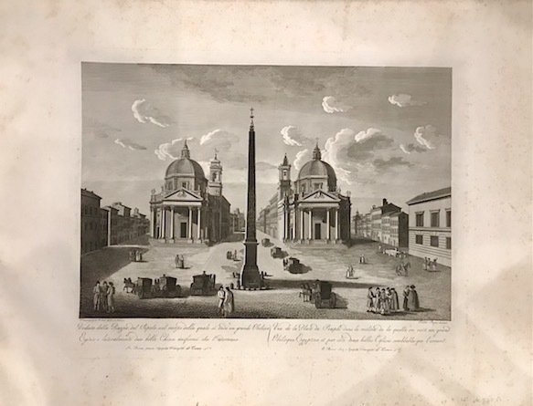 Veduta della Piazza del Popolo nel mezzo della quale si vede un grande Obelisco egizio e lateralmente due belle Chiese uniformi che l’adornano