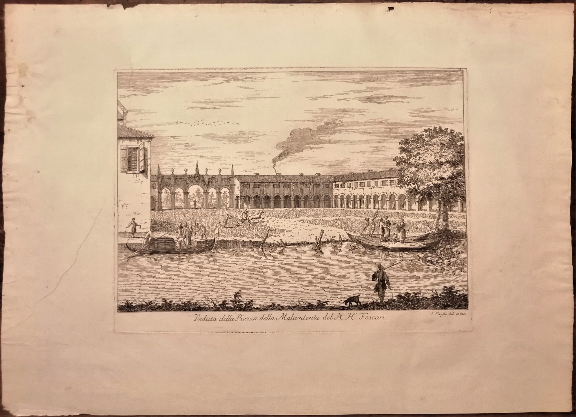 Incisione calcografica di 335 x 245 mm alla battuta, su foglio di 530 x 386 mm. Carta vergata veneziana; filigrana assente. Primo stato su tre. Iscrizioni: in basso sotto l'immagine: "Veduta della Piazza della Malcontenta del N.H. Foscari" Questo bellissimo foglio proviene dal celebre album del Costa "Le delizie del fiume Brenta nei palazzi e casini situati sopra le sue sponde dalla sua sboccatura nella laguna di Venezia infino alla citta di Padova…" stampato per la prima volta da Costa stesso nel 1750.