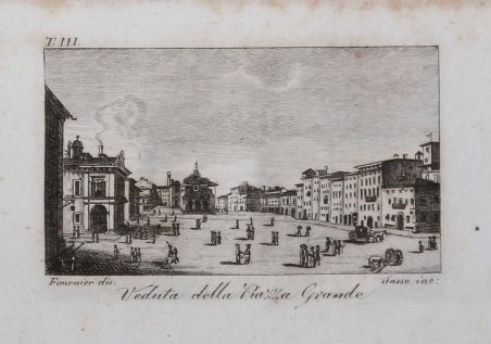 Veduta tratta dal celebre Il viaggio pittorico della Toscana, stampato a Firenze per Giovanni Marenigh, 1817. L’opera costituisce uno straordinario affresco iconografico dell'intera Toscana; riproducendo fedelmente le tavole incise dai fratelli Terreni durante il loro viaggio del 1801, fu pubblicata la prima volta tra il 1801 e il 1803 per i tipi del Tofani a Firenze e, in seguito, da Giovanni Marenigh nel 1817-1818 e nel 1822 in questa versione ridotta nel formato. L'abate Francesco Fontani (Firenze, 1748-1818), dotto erudito, dopo gli studi compiuti nel seminario del Collegio Eugeniano, si trasferì a Roma ove insegnò eloquenza nel Collegio Bandinelli. Si dedicò agli studi artistici e archeologici e, rientrato a Firenze, divenne Bibliotecario alla Riccardiana, occupandosi anche dell’Accademia della Crusca. Fu parroco nella chiesa di Santa Lucia dei Magnoli. View taken from the famous Il viaggio pittorico della Toscana, printed in Florence for Giovanni Marenigh, 1817. The work constitutes an extraordinary iconography of Tuscany; faithfully reproducing the plates engraved by the Terreni brothers during their journey in 1801, it was first published between 1801 and 1803 by Tofani in Florence and then by Giovanni Marenigh in 1817-1818 and in 1822 in this version reduced in size. The abbot Francesco Fontani (Florence, 1748-1818), learned scholar, after his studies in the seminary of the Eugenian College, moved to Rome where he taught eloquence in the Bandinelli College. He dedicated himself to artistic and archaeological studies and, having returned to Florence, became Librarian at the Riccardiana, also dealing with the Accademia della Crusca. He was parish priest in the church of Santa Lucia dei Magnoli. Cfr. Fossati Bellani, II, 3377; Lozzi, 5462, Bigazzi, 1341 e 1342, cita le edizioni 1801-1803 e 1817.