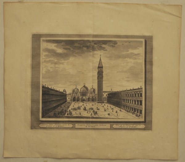 Acquaforte e bulino di mm 359 x 275 alla battuta. Vergata forte olandese. Foglio in perfette condizioni. Filigrana giglio e scudo RS. In basso le diciture: Veduta della Piazza, verso la Chiesa di S. Marco, Prospectus Plateae, à parte Ecclesiae D. Marci, Vue de la Place, du cote de l'Eglise de St. Marc; in piccolo, in basso a destra 46; in piccolo in alto a destra Pag. 305 a. Il foglio proviene dalla enciclopedica edizione di Georgius Graevius Thesaurus antiquitatum et historiarum Italiane, Leida 1704 - 1723 illustrante l'intera penisola italiana, nel tomo V dell'opera in 30 volumi, stampato da Peter Van Der AA nel 1722. Normalmente i differenti incisori dell'opera trassero spunto dalla vasta riproduzione iconografica del Carlevarijs. Johann Georg Graevius (correttamente Guava o Greffe) (29 Gennaio, 1632 - 11 Gennaio, 1703) fu uno studioso tedesco nato a Naumburg. Orientato verso studi giurisprudenziali mutò i suoi interessi verso la filologia dopo l'incontro con Johann Friedrich Gronovius. Durante il suo soggiorno ad Amsterdam, sotto l'influenza di Blondel abbandonò il luteranesimo e si unì alla Chiesa riformata, e nel 1656 fu chiamato dal principe elettore di Brandeburgo per la cattedra di retorica nella Università di Duisburg. Nel 1662 si trasferì alla Università di Utrecht, dove occupò la cattedra di retorica, e in aggiunta, dal 1667 fino alla sua morte, anche quella di storia e politica. Venne insignito di un riconoscimento speciale da Louis XIV, ma fu soprattutto apprezzato da Guglielmo III d'Inghilterra, che ne fece lo storiografo reale. Le sue due opere più importanti sono la antiquitatum Thesaurus Romanarum (1694-1699, in 12 volumi), e il Thesaurus antiquitatum et Historiarum Italiae pubblicato dopo la sua morte. Peter van der Aa (Leida, 1659 – Leida, agosto 1733) fu uno dei maggiori editori europei del diciassettesimo e diciottessimo secolo, operando circa dal 1682 a Leida insieme ai suoi fratelli. Tradusse, tra le altre opere, anche quelle di Erasmo da Rotterdam, come l'Elogio della follia e pubblicò le raccolte di storia e archeologia di J.G. Graeve e le opere botaniche di Jan Gronov.