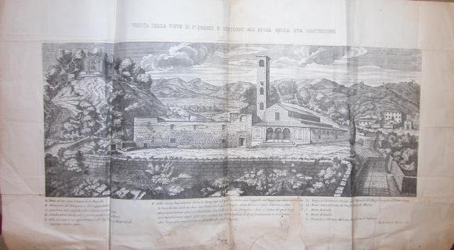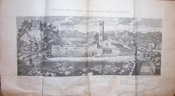 Incisione originale, databile seconda metà del XIX secolo, in formato cm.32,3x59, di provenienza sconosciuta, realizzata da Antonio Lorenzini su disegno di Cresenzio Onofrio. Viene raffigurata la chiesa ubicata nei pressi di valcava, nel Mugello, con indicazione di particolari architettonici e individuazione dei dintorni. Alcuni restauri cartacei. "La Pieve di San Cresci in Valcava si trova nel comune di Borgo San Lorenzo e risale al VI secolo. Nel luogo in cui essa si trova, molto probabilmente c’era un tempio pagano, perché gli scavi ne fecero trovare le fondamenta, insieme a monete romane (fra le quali alcune dell’Imperatore Decio), pietre scolpite con serpi, ossa di animali sacrificati e altri oggetti. Si ritiene che in questo luogo sia avvenuto il martirio di San Cresci del quale la chiesa conservava il cranio, custodito in un busto-reliquiario in argento ( XVIII secolo), voluto da Cosimo III su disegno di Foggini (adesso nella chiesa di Sagginale). Anche la Madonna col Bambino e Angeli del Maestro della Madonna Strauss, della chiesa di San Cresci, si trova oggi a Sagginale. Nella pieve di San Cresci in Valcava si trovano le ossa e le ceneri dei martiri Enzo, Omnione e Panfila, riconosciute nel 1613 e situate in urne di marmo negli altari laterali e sotto la gradinata dell’altar maggiore. Questa chiesa fu consacrata nel 1703. Nel 1700-1702 essa subì dei restauri e nel 1704 fu costruito il portico. Anticamente era costruita con bozze di pietra, aveva tre navate, tre piccole finestre sulla navata laterale ed altre tre nell’abside. I restauri furono commissionati da Cosimo III: la chiesa, con la bolla di Innocenzo III, fu annessa al convento dei padri Gesuiti di Firenze. La chiesa conserva affreschi raffiguranti la Storia del Martirio di san Cresci, opera dell’Ademollo, che furono danneggiati dal terremoto del 1919, un dipinto che rappresenta la Madonna col Bambino, eseguita "alla maniera" del Gaddi, due tabernacolini, la Decollazione di San Cresci, opera di Francesco Lapi del 1615. Il fonte battesimale di pietra è in forma ottagonale. Vi sono inoltre: Il Transito di San Cresci con i Santi Enzo e Omnione e: San Panfila e San Cerbone, opere di Carlo Ventura eseguite su commissione di Cosimo III. Nel XIII secolo il territorio di San Cresci fu sotto la giurisdizione dei vescovi fiorentini. Vicino alla chiesa si trova l’Oratorio di Cerbone fatto costruire da Cosimo III e l’Oratorio della Vergine Maria, detta Della Febbre" (da Wikipedia). Codice libreria 115482.
