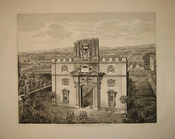 Incisione originale su rame (cm. 50x41 più ampi margini bianchi) tratta da ‘Le Porte antiche e moderne del Recinto di Roma con le Mura, Prospetti e Piante geometriche’. Alcune piccole macchie marginali, ma ottimo esemplare. Rara.