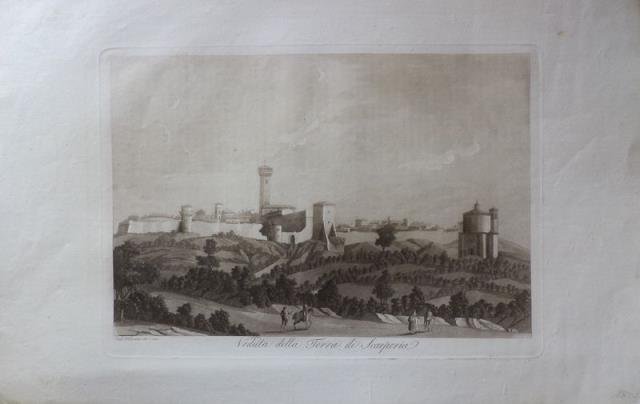Incisione in rame all’acquatinta, stampata a inchiostro bruno su carta vergata coeva, cm 26 x 36,5 circa (alla lastra), ampi margini, lievissime bruniture, molto buono lo stato di conservazione. Il “Viaggio Pittorico della Toscana” di Francesco Fontani, fu pubblicato per la prima volta a Firenze dall’editore Giuseppe Tofani, tra il 1801 e il 1803. L’opera è da considerarsi come uno fra i più importanti e suggestivi libri figurati sulla Toscana, sia per la qualità grafica delle incisioni, sia per la gran quantità delle località ritratte. Nei tre volumi in folio che compongono questa poderosa pubblicazione sono infatti inserite 209 tavole, finemente incise all’acquatinta dai fratelli Antonio e Jacopo Terreni (attivi a Livorno e Firenze tra la fine del diciottesimo e l’inizio del diciannovesimo secolo), da Giovanni Pera e da altri. Nove di queste tavole sono stampate a doppia pagina, tutte le altre sono stampate a foglio singolo e raffigurano architetture o paesaggi relativi sia alle principali località che ai centri minori della Toscana. Grande fu il successo del “Viaggio Pittorico della Toscana”: una seconda edizione dell’opera venne alla luce, in formato ridotto, fra 1817 e il 1818; notevole fu anche il seguito di riproduzioni e di rifacimenti cui l’opera fu sottoposta, in Italia e all’estero, dal momento che molti saranno i libri illustrati con incisioni derivanti dalla grafica dei fratelli Terreni. (Cfr: Cremonini pp. 95, 145, 148, 95, Frati, p. 301).