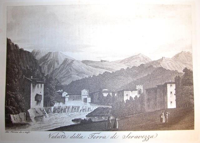 VEDUTA DELLA TERRA DI SERAVEZZA. Riproduzione tratta da "Viaggio pittorico della Toscana" di Jacopo e Antonio Terreni.