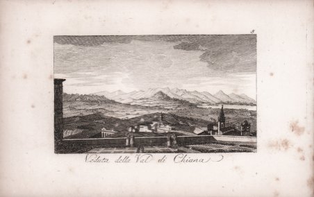 Veduta tratta dal celebre "Il viaggio pittorico della Toscana", stampato a Firenze, per Giovanni Marenigh, 1817.Celebre opera che costituisce uno straordinario affresco iconografico dell'intera Toscana.L'abate Francesco Fontani (Firenze, 1748-1818), dotto erudito, dopo gli studi compiuti nel seminario del Collegio Eugeniano si trasferì a Roma ove insegnò eloquenza nel Collegio Bandinelli. Si dedicò agli studi artistici e archeologici e, rientrato a Firenze, divenne Bibliotecario alla Riccardiana, occupandosi anche della Accademia della Crusca. Fu parroco nella chiesa di Santa Lucia dei Magnoli."Il viaggio pittorico della Toscana" costuisce la sua opera più rinomata.Riproducendo fedelmente le tavole incise dai fratelli Terreni durante il loro viaggio del 1801,fu pubblicata la prima volta tra il 1801 e il 1803 per i tipi del Tofani a Firenze e in seguito, in questa versione ridotta nel formato, da Giovanni Marenigh nel 1817-1818 e nel 1822. View from the famous "Il viaggio pittorico della Toscana", printed in Florence, for Giovanni Marenigh, 1817. The work is considered one of the most important and suggestive pictorial books on Tuscany. Abbot Francesco Fontani (Florence, 1748-1818), after his studies in the seminary of the Collegio Eugeniano ' moved to Rome where he ' taught ' in the Collegio Bandinelli. He accomplished also ' artistic and archaeological studies and, returning to Florence, he became Librarian at the Riccardiana, also taking care of the Accademia della Crusca. He was priest in the church of Santa Lucia dei Magnoli. "Il viaggio pittorico della Toscana" is his most famous work. Perfectly reproducing the plates engraved by the Terreni brothers during their 1801 voyage, it was first published between 1801 and 1803 for the types of Tofani in Florence and later, in this reduced format version, by Giovanni Marenigh in 1817-1818 and in 1822. Cfr. Fossati Bellani, II, 3377; Lozzi, 5462, Bigazzi, 1341 e 1342, cita le edizioni 1801-1803 e 1817.