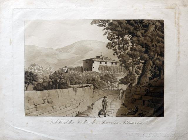 Firenze, 1830 circa. Incisione in rame all'acquatinta, cm 30 x 39 (alla lastra) più margini. Inlastra, al centro, «Telemaco Bonajuti dis. e incise». Buona conservazione.