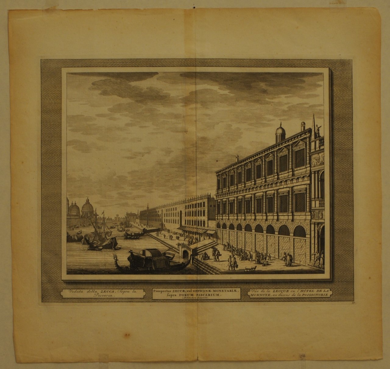 Acquaforte e bulino di mm 350 x 256. Vergatina olandese. Filigrana non rilevata. Foglio in perfette condizioni, margini pieni, carta candida tranne lievissime fiorifure ai margini bianchi. In basso le diciture: "Veduta della Zecca, Sopra la Pescaria" "Prospectus Zeccae, vel Officinae monetariae, supra Forum Piscarium. Architectura Sansovini" "Vue de la Zeque ou l'Hotel de la Monnoye, dessus de la Poissonorie"; in piccolo, in basso a destra "55". Georgius Graevius "Thesaurus antiquitatum et historiarum Italiane", Leida 1704 - 1723. Foglio tecnicamente di ottimo livello, tratto dall'enciclopedica edizione di Peter Van der AA illustrante l'intera penisola italiana. Il foglio stà nel tomo V dell'opera in 30 volumi, stampato appunto nel 1722.