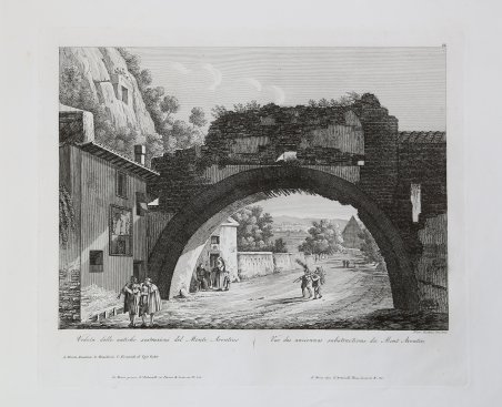 Veduta tratta dall’opera ' Nuova Raccolta delle principali vedute antiche e moderne dell’Alma città di Roma e sue vicinanze, incise a bulino da Pietro ed Achille Parboni e Pietro Ruga l’anno 1830, ' edita da Giacomo Antonelli con imprint ' Roma presso Giacom.o Antonelli in Via del Corso alle Convertite num 179B. Le tavole dell’opera furono incise tra il 1825 e il 1829 da diversi incisori tra i quali i fratelli Parboni e Pietro Ruga. Ciascuna reca il nome dell’incisore, l’indirizzo editoriale e una doppia didascalia in italiano e in francese. Acquaforte, in ottimo stato di conservazione. View taken from the work ' Nuova Raccolta delle principali vedute antiche e moderne dell'Alma città di Roma e sue vicinanze, engraved with engraving by Pietro and Achille Parboni and Pietro Ruga the year 1830, published by Giacomo Antonelli with imprint ' Roma presso Giacom.o Antonelli in Via del Corso alle Convertite num 179B. The plates were engraved between 1825 and 1829 by several engravers including the Parboni brothers and Pietro Ruga. Each bears the engraver's name, editorial address, and a double caption in Italian and French. Etching, in very good condition. Cfr.