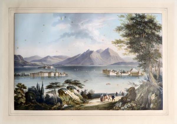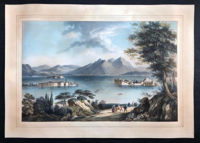 1850 circa. Litografia in coeva coloritura a mano, cm 35 x 54,5 (il foglio). Bella veduta d’insieme del centro lago, con le isole Borromee e gli eleganti edifici dell’Isola Bella, l’Isola Madre, l’Isola dei Pescatori (compare anche l’Isolino di San Giovanni). I monti fanno da cornice al paesaggio e alcune figure di popolani e signori in primo piano ravvivano la scena e la colorazione. Esemplare rifilato ai margini della parte figurata, in raffinata coloritura coeva, buono lo stato di conservazione. .