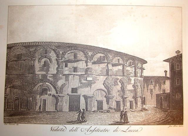 VEDUTA DELLE ROVINE DELL' ANFITEATRO DI LUCCA. Riproduzione tratta da "Viaggio pittorico della Toscana" di Jacopo e Antonio Terreni.
