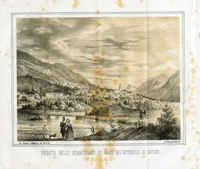 Litografia di cm 22x17 (parte incisa). Condizioni : USATO - Stato : Buono, ordinari segni d'uso e del tempo, qualche fioritura. Altre note : Ripresa dal disegno di Fortunato Depaoli; pubblicata in Girolamo Avancini, Giuseppe Pacher, Le acque ferruginose di Levico nel Trentino dette del vetriolo . Trento, Seiser, 1861.