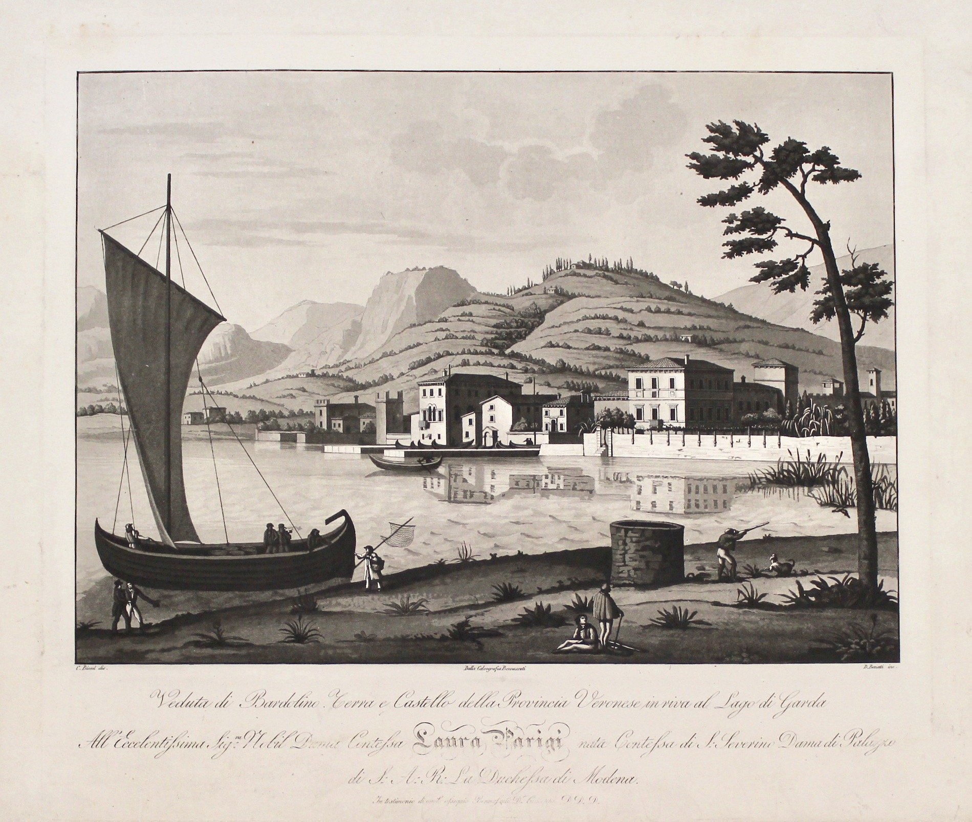 Incisione all'acquatinta dedicata alla contessa Laura Parigi, eseguita da D. Bonatti su disegno di C. Bissol, 340x380 (misura della battuta del rame) + margini assai ampi non rifilati. Piacevole veduta della cittadina gardesana vista da sud con bella scena di vita quotidiana in primo piano. Ben conservata, sebbene presenti qualche leggera piega e lievi tracce di sporco superficiale; la stampa è la più grande incisione pubblicata sulla cittadina di Bardolino (pochissime sono le rappresentazioni di questo piccolo centro) e fa parte di una fra le più ampie ed importanti serie di vedute su Verona e località della provincia pubblicate nel XIX secolo.